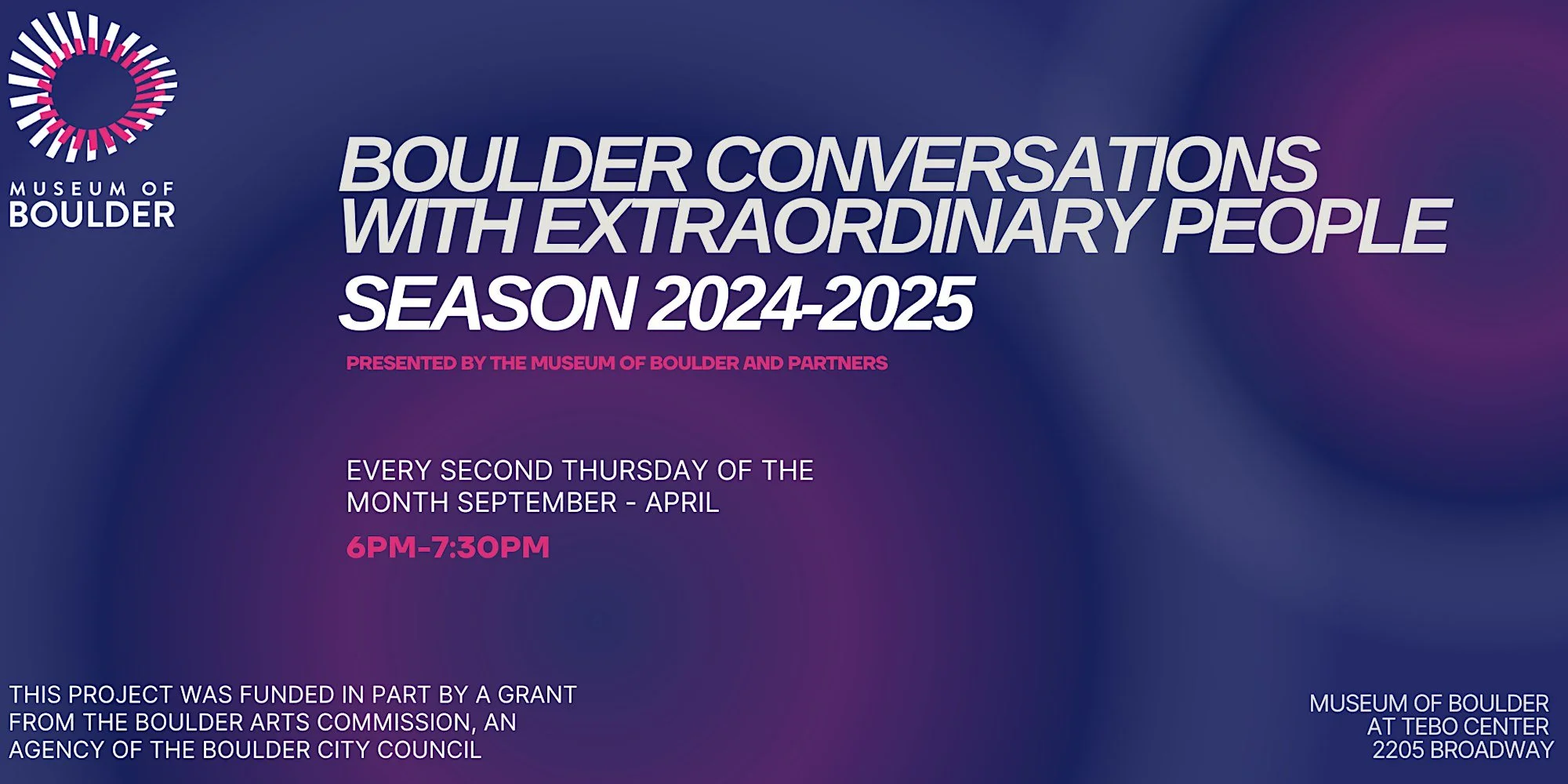 Boulder Conversations with Extraordinary People is back! Join us this fall for our 12th season of our well-loved speaker series. This series highlights the innovative people whose connection to our city makes Boulder the remarkable place that it is today. This season’s theme is Diversity and Partnership, and we have chosen to collaborate with eight impactful Boulder organizations that have made immense contributions to the living history of our community. Conversations are held every second Thursday of the month running September 2024-April 2025. $15 ticket price includes light refreshments.