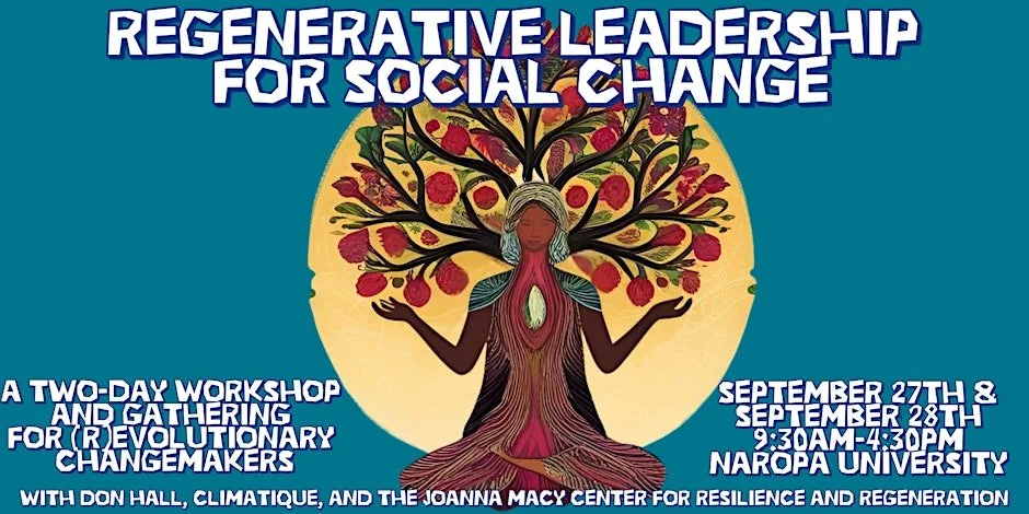 Led by Don Hall, author of The Regeneration Handbook, in collaboration with Climatique, the Joanna Macy Center for Resilience and Regeneration at Naropa University and Boulder Peace Week, this transformational workshop will explore seven essential ingredients for effective community organizing, offering valuable perspectives, insights, tools, practices, and resources for aspiring and experienced changemakers alike.